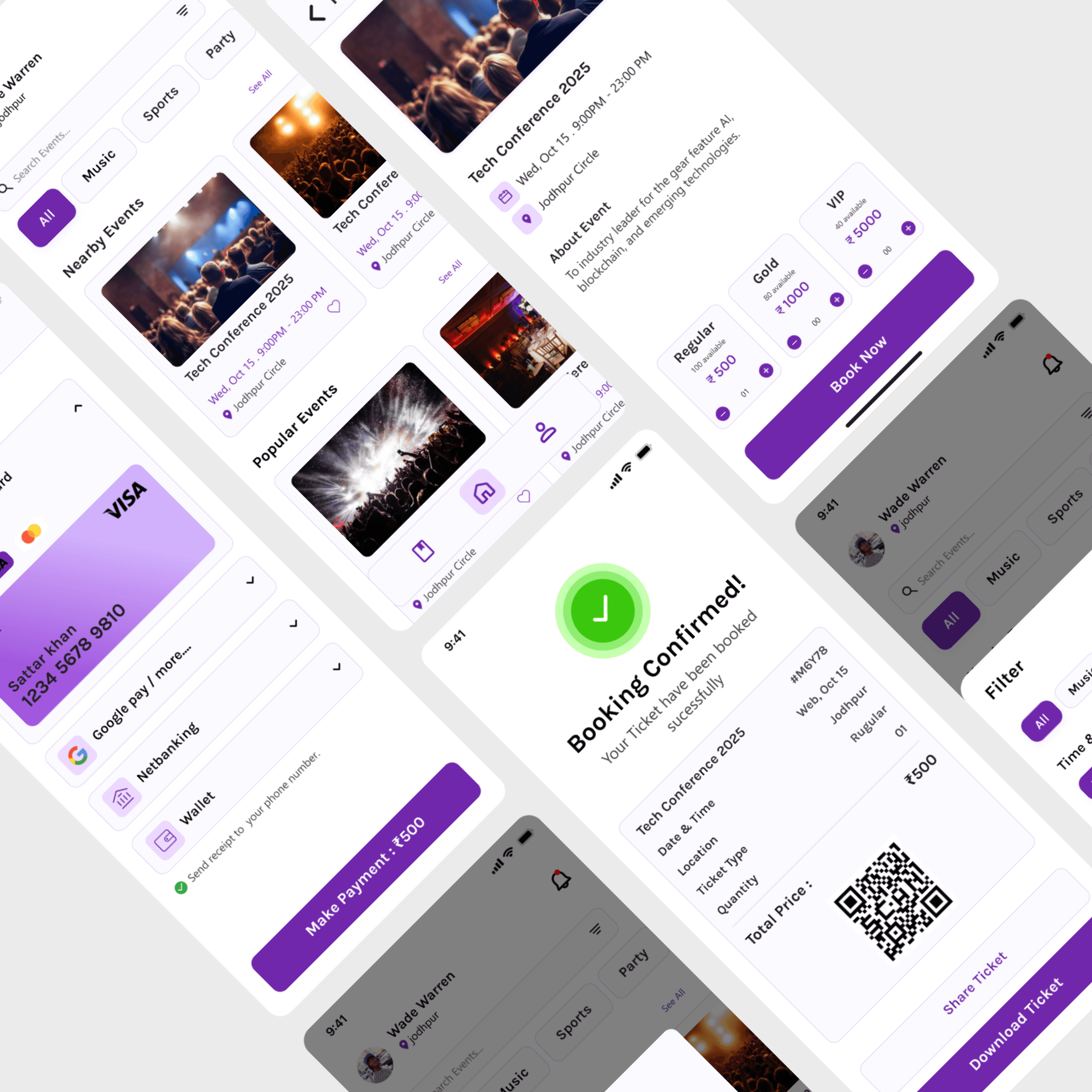 Designed a complete event booking app UI with nearby events, ticket booking, payment options, and confirmation screens.